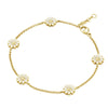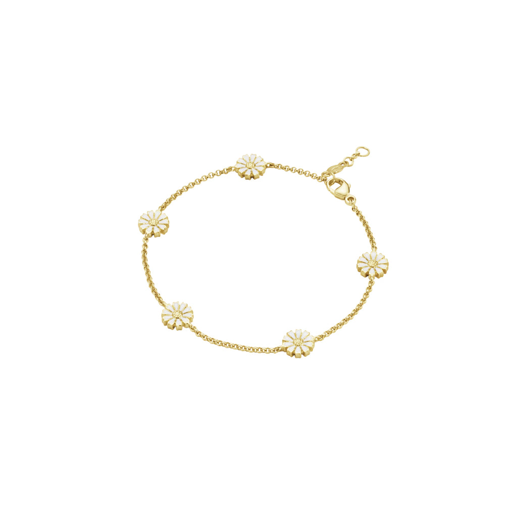 Fine tusenfryd, håndmalt med hvit emalje, fordeler seg på et tynt gullbelagt kjede og utgjør et elegant armbånd. Smykket gir et hint av blomster og vekker minner om sjarmerende håndlagde kranser med naturens egne tusenfryd.