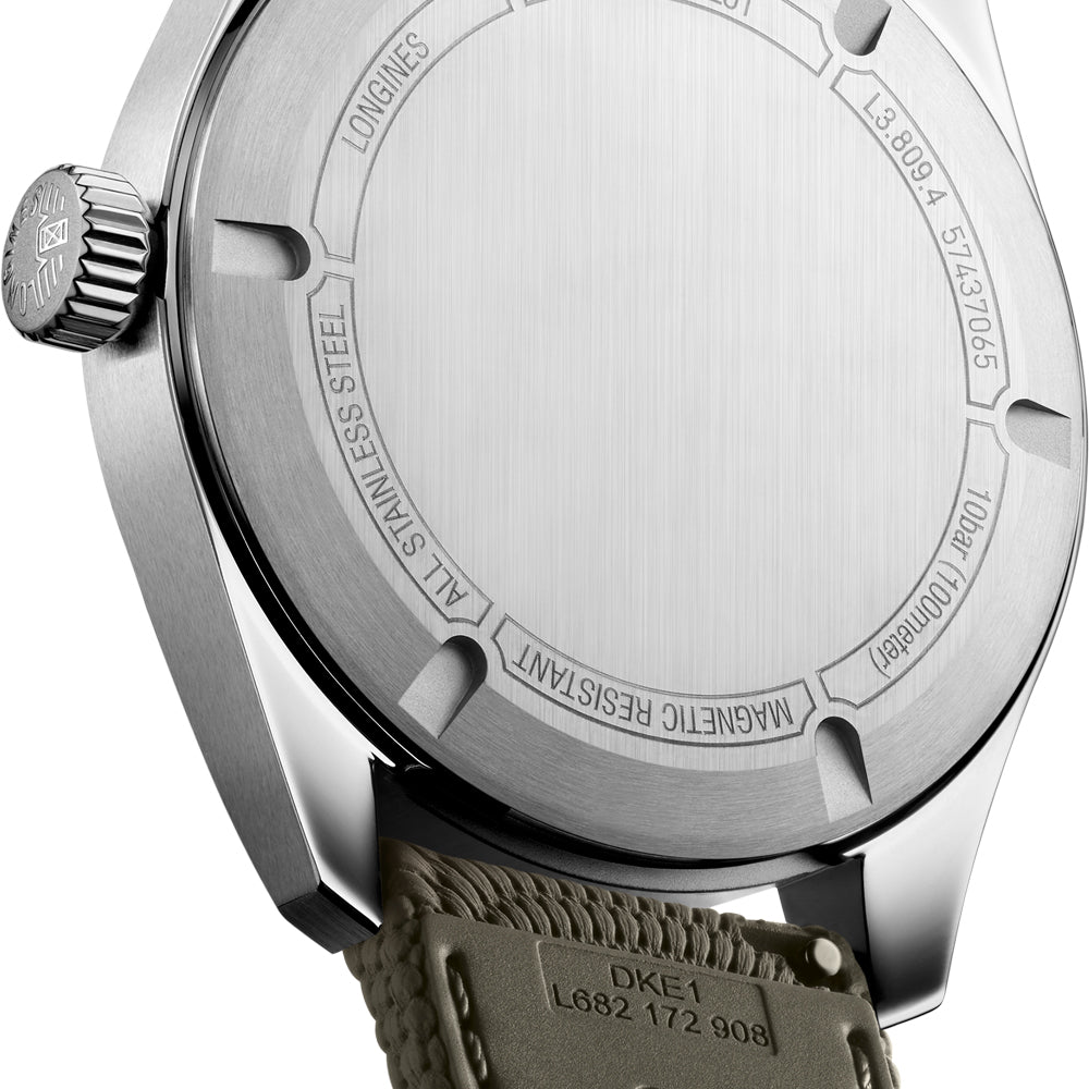 Den nye Longines Spirit Pilot er 39 mm i diameter og leveres med grønn gummireim. Inni finner du et L888.4 urverk med opptil 72 timers gangreserve.