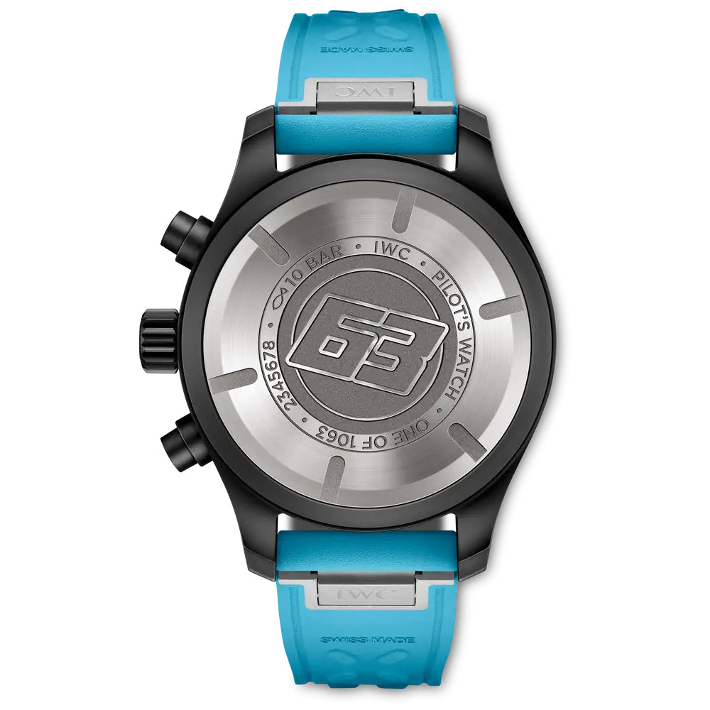 Limitert til 1063 eksemplarer, kasse i sort keramikk og blå gummireim inspirert av fargen på hjelmen til George Russel. Dette er IWC på sitt beste!