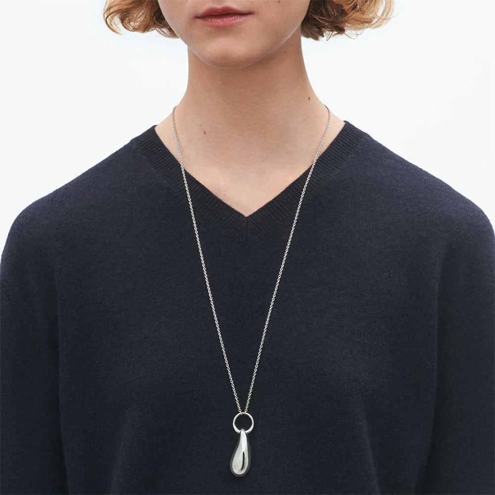Dette lange anhenget bæres i et lett kjede i sterlingsølv og har de dråpeformede linjene som kjennetegner Reflect-kolleksjonen fra Jacqueline Rabun. Designen henger i en ring i sølv som tilfører smykket en ekstra dimensjon. Reflect-kolleksjonen ble lansert i 2022 og bygger på Rabuns nytolkning av klassiske kjeder gjennom smykker med skulpturelle ledd og naturlige former. Resultatet er en tidløs serie som hyller individualiteten og det personlige uttrykket.
