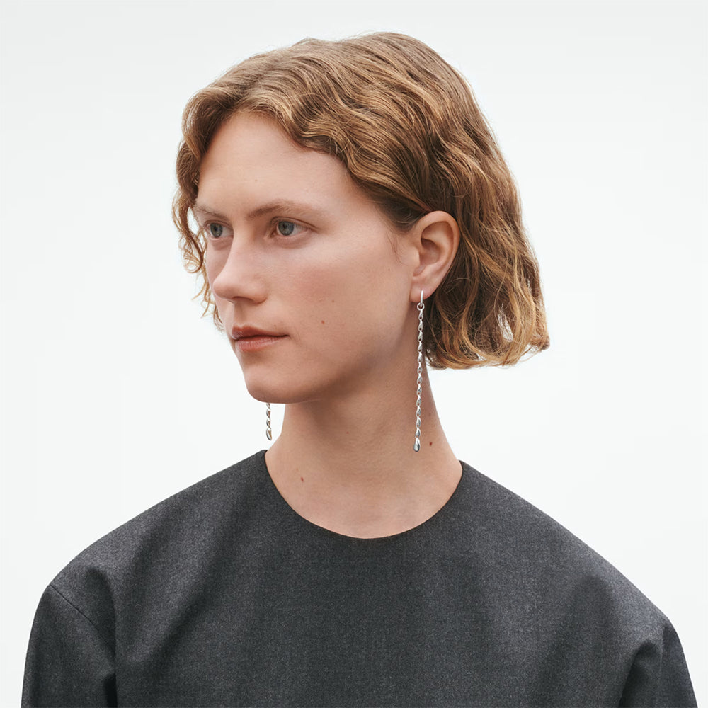 Disse øreringene har en avlang form som gir særpreg. Designen er bygd opp av ledd i sterlingsølv, som kjennetegner Reflect-kolleksjonen fra Jacqueline Rabun, og gjenspeiler seriens skulpturelle formspråk. Reflect-kolleksjonen ble lansert i 2022 og stammer fra designerens tolkning av klassiske kjeder – et symbol på skjønnheten i det personlige uttrykket.