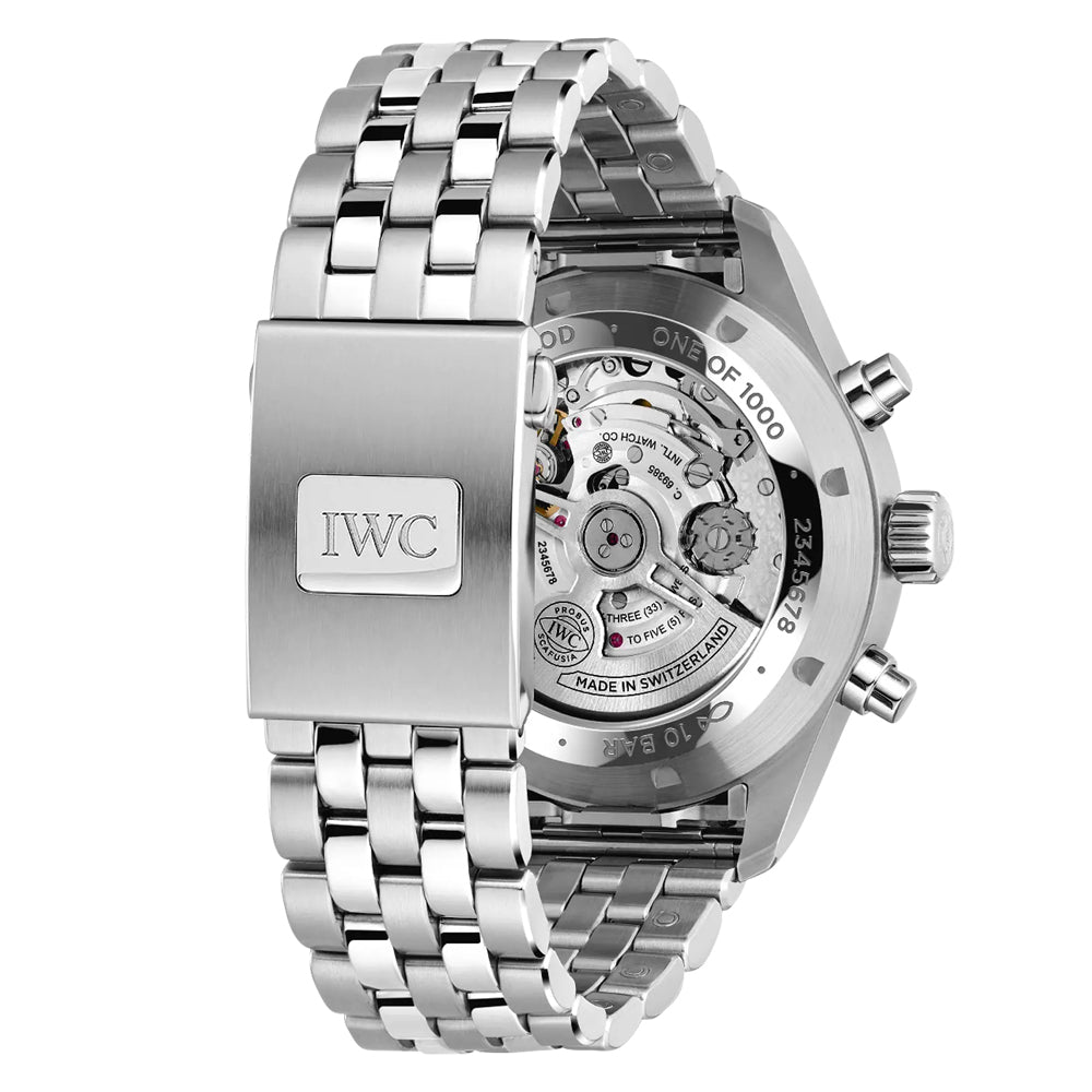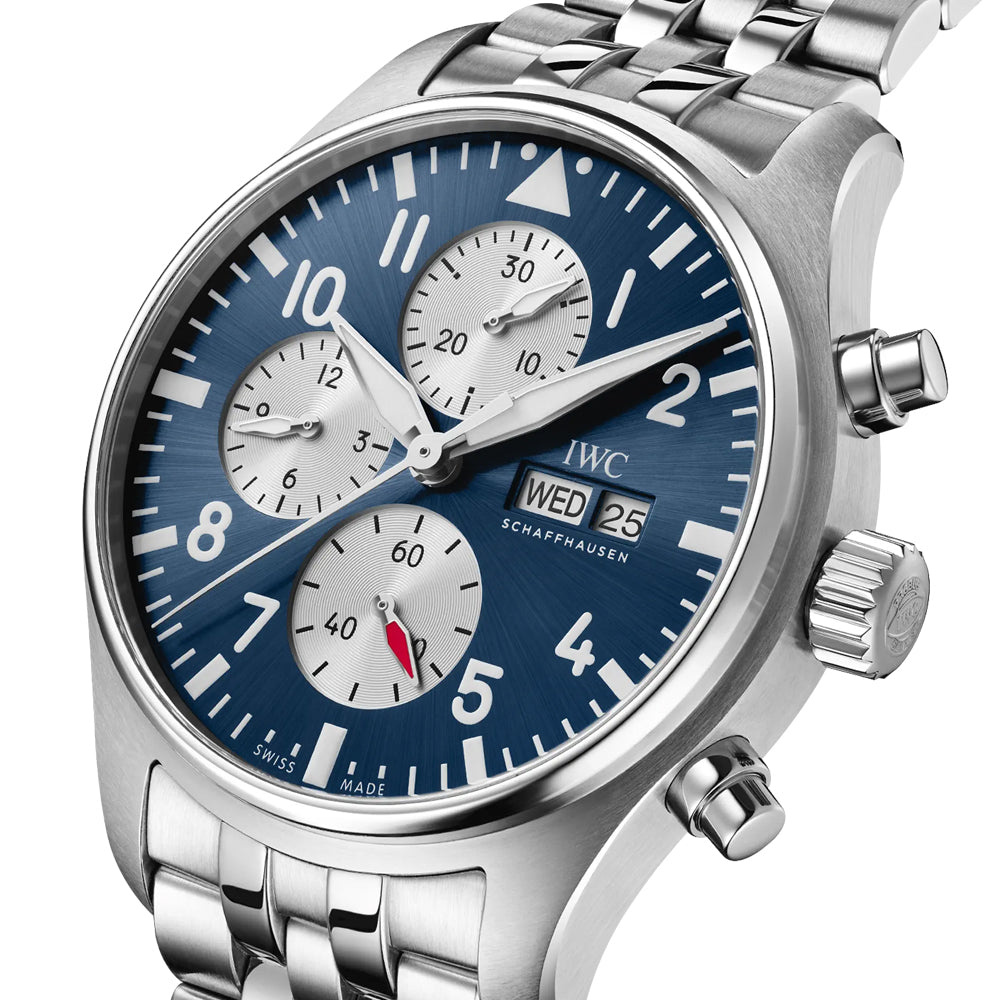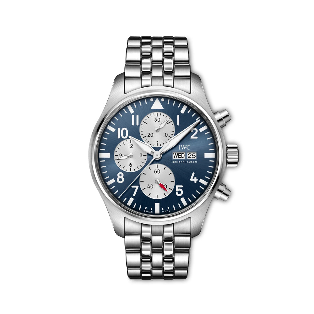 Pilot's Watch Chronograph har lenge vært IWCs mest populære modell og det er enkelt å skjønne hvorfor. Få andre klokker kombinerer sportslighet og eleganse like bra som denne. I god B-Uhr ånd er lesbarhet satt i høysetet og alle overflødige detaljer rensket bort. Pilotklokker skal være robuste "toolwatches", som skal brukes daglig og tåle hverdagslig bruk. Med IWCs uslåelige sans for detaljer og nøyaktighet løftes finnish og utstråling til øverste nivå. Pilot's Watch Chronograph 43 er utstyrt med IWCs egenproduserte urverk. Den kommer også med remmer som kan skiftes uten verktøy og bare med et lite klikk. Dermed kan man velge mellom skinnremmer og gummiremmer i forskjellige farger i tillegg til stållenke.