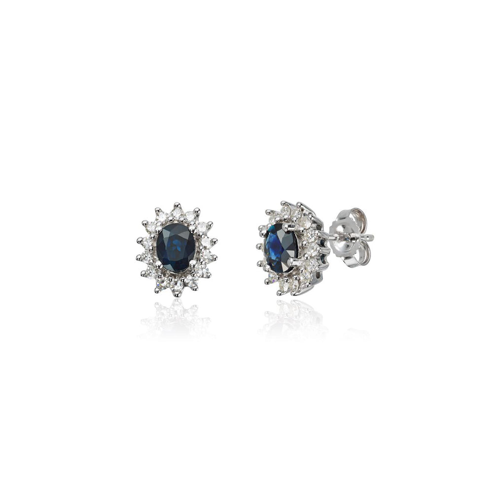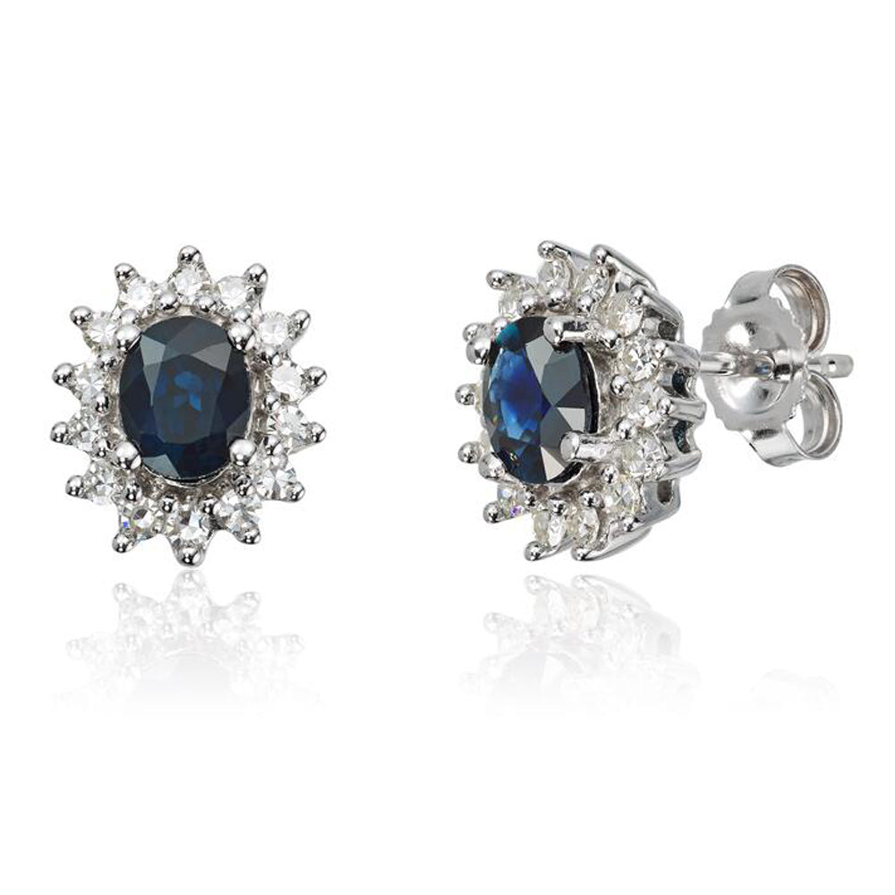 Lekker og klassisk ørepynt i hvitt gull med safir omkranset av diamanter.